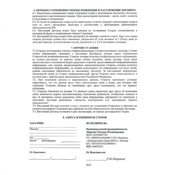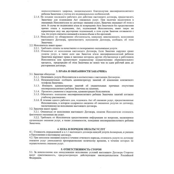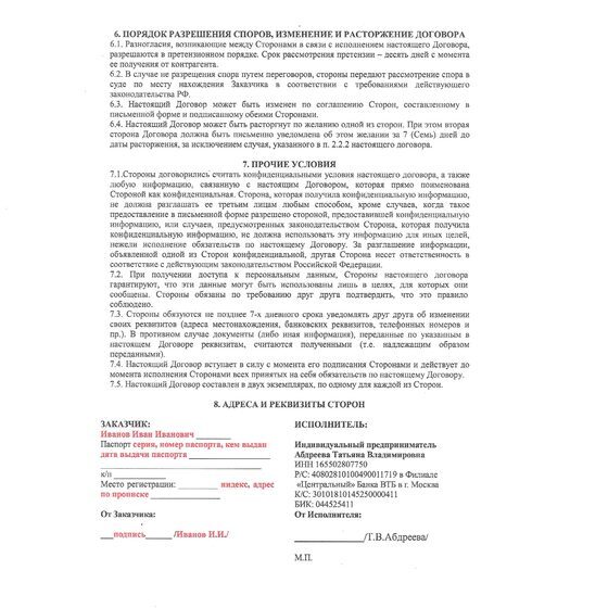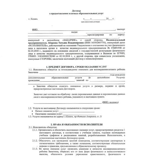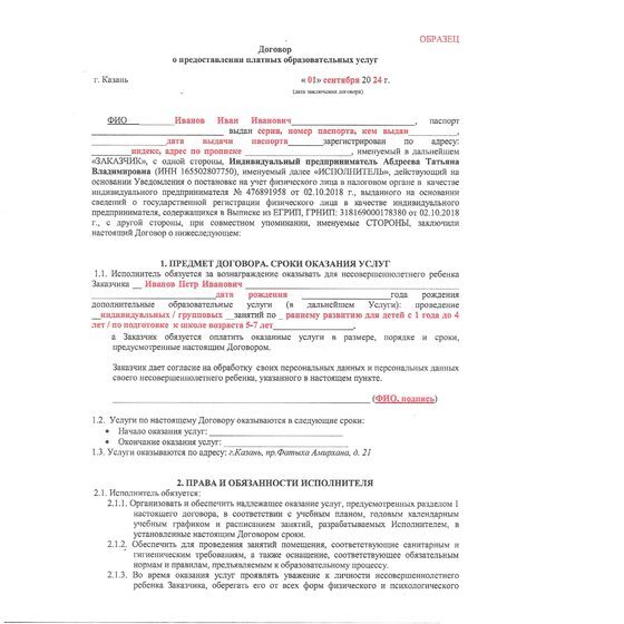 Образец заполнения Договора о предоставлении платных услуг