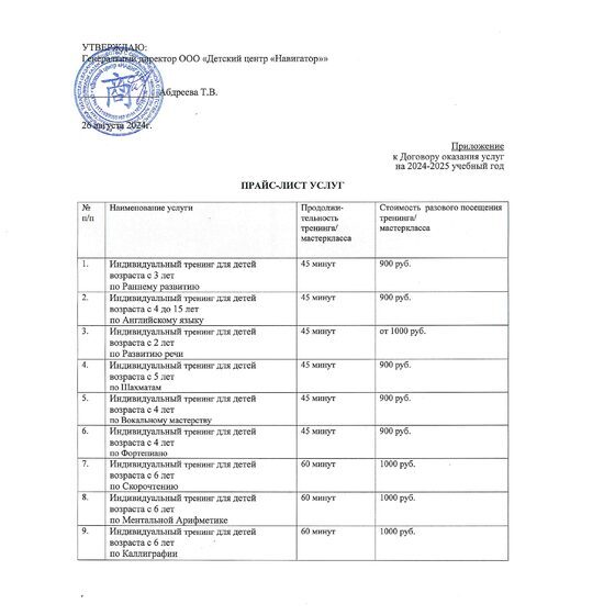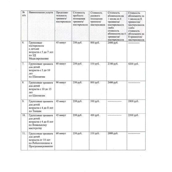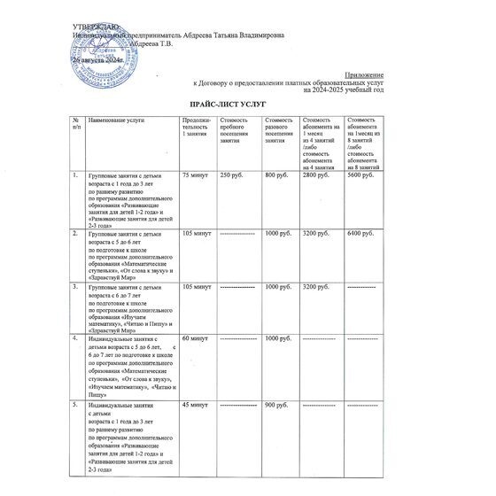 Прайс-лист ООО, Индивидуальные занятия