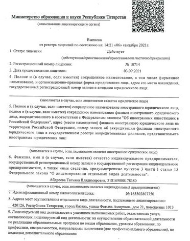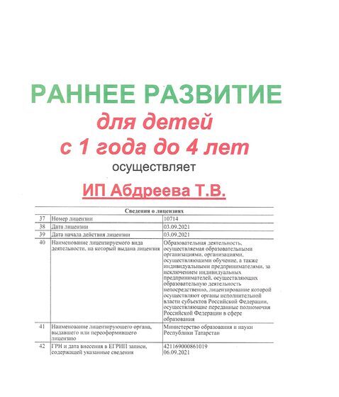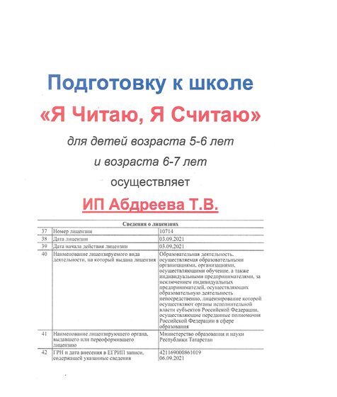 Подготовку к школе осуществляет ИП Абдреева Т.В.
