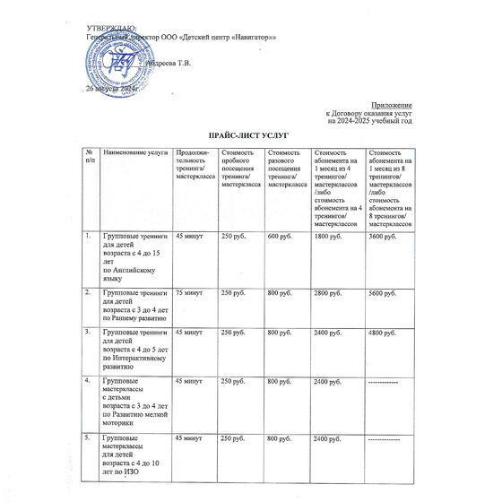 Прайс-лист услуг ООО, лист 1
