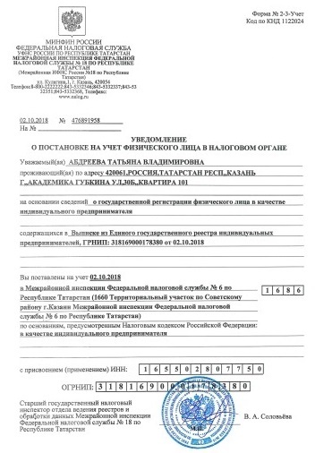 Уведомление о регистрации ИП